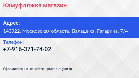 Камуфляжка, магазин по адресу 143922, Московская область, Балашиха, Гагарина, 7/4 в дальнейшем Организация, размещена в следующих категориях: