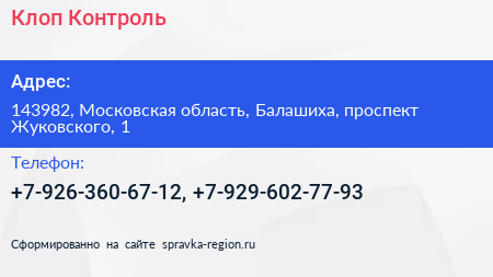 Клоп-Контроль по адресу 143982, Московская область, Балашиха, проспект Жуковского, 1 в дальнейшем Организация, размещена в следующих категориях: