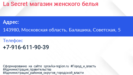 La Secret, магазин женского белья по адресу 143980, Московская область, Балашиха, Советская, 5 в дальнейшем Организация, размещена в следующих категориях: