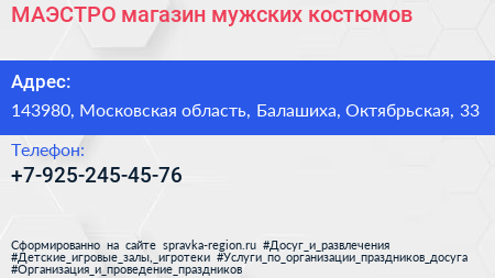 МАЭСТРО, магазин мужских костюмов по адресу 143980, Московская область, Балашиха, Октябрьская, 33 в дальнейшем Организация, размещена в следующих категориях: