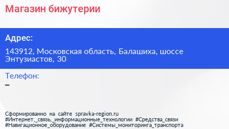 Магазин бижутерии по адресу 143912, Московская область, Балашиха, шоссе Энтузиастов, 30 в дальнейшем Организация, размещена в следующих категориях:
