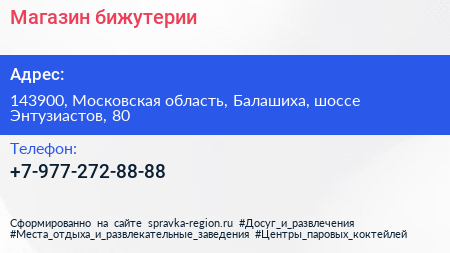 Магазин бижутерии по адресу 143900, Московская область, Балашиха, шоссе Энтузиастов, 80 в дальнейшем Организация, размещена в следующих категориях: