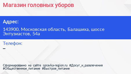 Магазин головных уборов по адресу 143900, Московская область, Балашиха, шоссе Энтузиастов, 54а в дальнейшем Организация, размещена в следующих категориях: