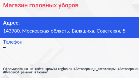 Магазин головных уборов по адресу 143980, Московская область, Балашиха, Советская, 5 в дальнейшем Организация, размещена в следующих категориях: