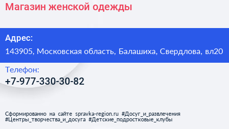 Магазин женской одежды по адресу 143905, Московская область, Балашиха, Свердлова, вл20 в дальнейшем Организация, размещена в следующих категориях: