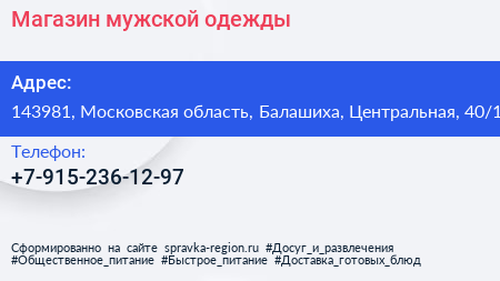 Магазин мужской одежды по адресу 143981, Московская область, Балашиха, Центральная, 40/1 в дальнейшем Организация, размещена в следующих категориях: