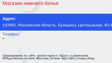 Магазин нижнего белья по адресу 143981, Московская область, Балашиха, Центральная, 40/1 в дальнейшем Организация, размещена в следующих категориях: