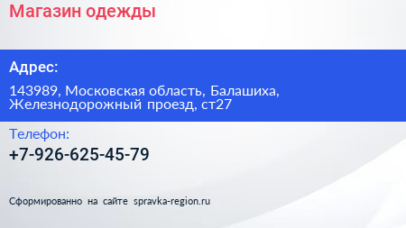 Магазин одежды по адресу 143989, Московская область, Балашиха, Железнодорожный проезд, ст27 в дальнейшем Организация, размещена в следующих категориях: