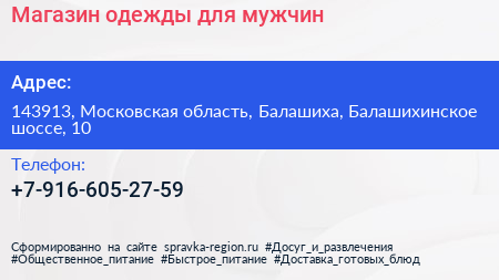 Магазин одежды для мужчин по адресу 143913, Московская область, Балашиха, Балашихинское шоссе, 10 в дальнейшем Организация, размещена в следующих категориях: