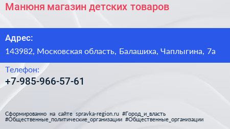 Манюня, магазин детских товаров по адресу 143982, Московская область, Балашиха, Чаплыгина, 7а в дальнейшем Организация, размещена в следующих категориях: