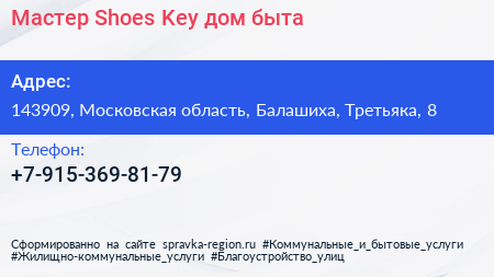 Мастер Shoes & Key, дом быта по адресу 143909, Московская область, Балашиха, Третьяка, 8 в дальнейшем Организация, размещена в следующих категориях: