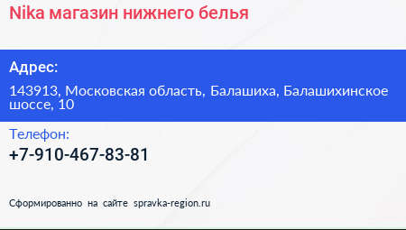 Nika, магазин нижнего белья по адресу 143913, Московская область, Балашиха, Балашихинское шоссе, 10 в дальнейшем Организация, размещена в следующих категориях: