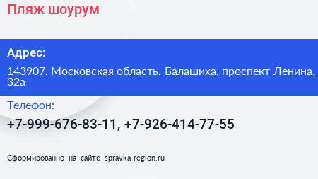 Пляж, шоурум по адресу 143907, Московская область, Балашиха, проспект Ленина, 32а в дальнейшем Организация, размещена в следующих категориях: