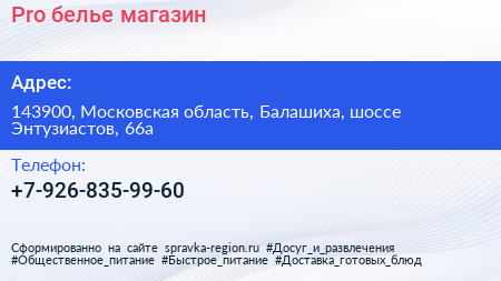 Pro белье, магазин по адресу 143900, Московская область, Балашиха, шоссе Энтузиастов, 66а в дальнейшем Организация, размещена в следующих категориях: