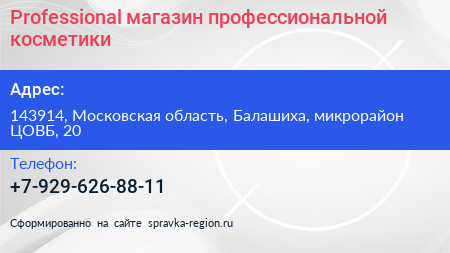 Professional, магазин профессиональной косметики по адресу 143914, Московская область, Балашиха, микрорайон ЦОВБ, 20 в дальнейшем Организация, размещена в следующих категориях:
