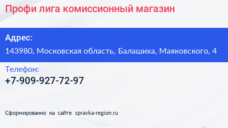 Профи-лига, комиссионный магазин по адресу 143980, Московская область, Балашиха, Маяковского, 4 в дальнейшем Организация, размещена в следующих категориях: