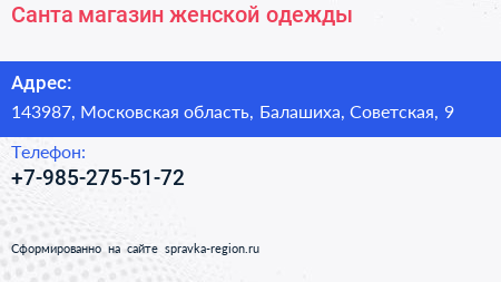 Санта, магазин женской одежды по адресу 143987, Московская область, Балашиха, Советская, 9 в дальнейшем Организация, размещена в следующих категориях:
