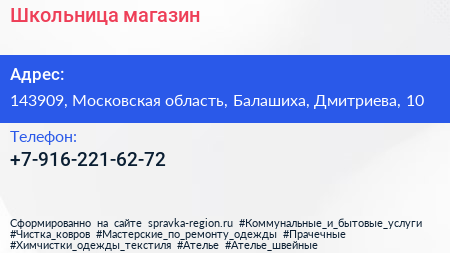 Школьница, магазин по адресу 143909, Московская область, Балашиха, Дмитриева, 10 в дальнейшем Организация, размещена в следующих категориях: