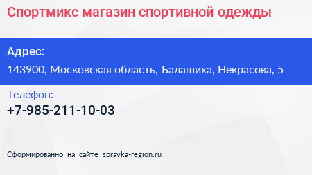 Спортмикс, магазин спортивной одежды по адресу 143900, Московская область, Балашиха, Некрасова, 5 в дальнейшем Организация, размещена в следующих категориях: