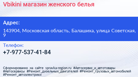 Vbikini, магазин женского белья по адресу 143904, Московская область, Балашиха, улица Советская, 9 в дальнейшем Организация, размещена в следующих категориях: