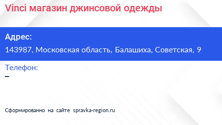 Vinci, магазин джинсовой одежды по адресу 143987, Московская область, Балашиха, Советская, 9 в дальнейшем Организация, размещена в следующих категориях:
