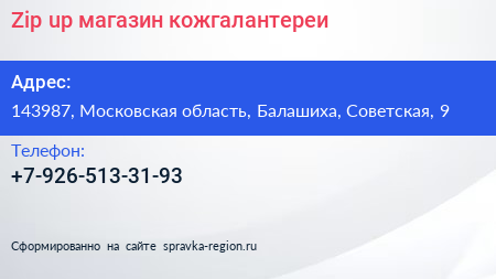 Zip-up, магазин кожгалантереи по адресу 143987, Московская область, Балашиха, Советская, 9 в дальнейшем Организация, размещена в следующих категориях: