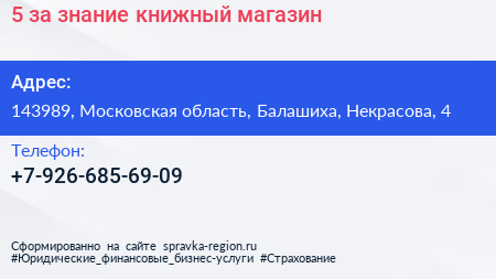 5`за знание, книжный магазин по адресу 143989, Московская область, Балашиха, Некрасова, 4 в дальнейшем Организация, размещена в следующих категориях: