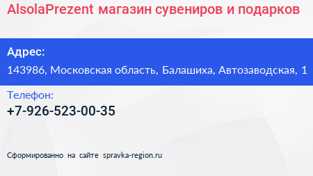 AlsolaPrezent, магазин сувениров и подарков по адресу 143986, Московская область, Балашиха, Автозаводская, 1 в дальнейшем Организация, размещена в следующих категориях: