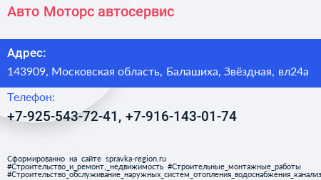 Авто-Моторс, автосервис по адресу 143909, Московская область, Балашиха, Звёздная, вл24а в дальнейшем Организация, размещена в следующих категориях: