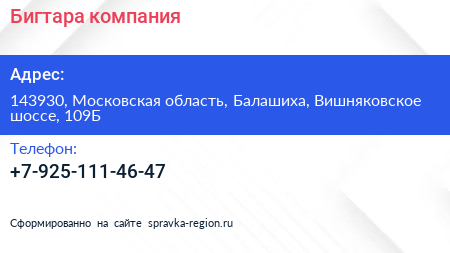 Бигтара, компания по адресу 143930, Московская область, Балашиха, Вишняковское шоссе, 109Б в дальнейшем Организация, размещена в следующих категориях: