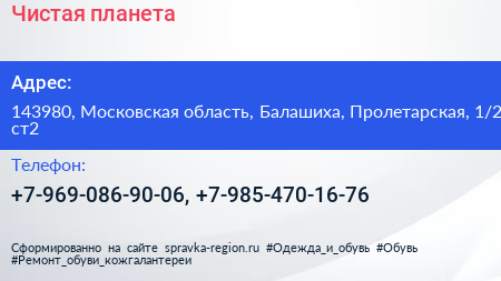 Чистая планета по адресу 143980, Московская область, Балашиха, Пролетарская, 1/2 ст2 в дальнейшем Организация, размещена в следующих категориях: