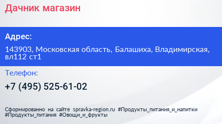 Дачник, магазин по адресу 143903, Московская область, Балашиха, Владимирская, вл112 ст1 в дальнейшем Организация, размещена в следующих категориях:
