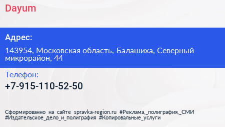 Dayum по адресу 143954, Московская область, Балашиха, Северный микрорайон, 44 в дальнейшем Организация, размещена в следующих категориях: