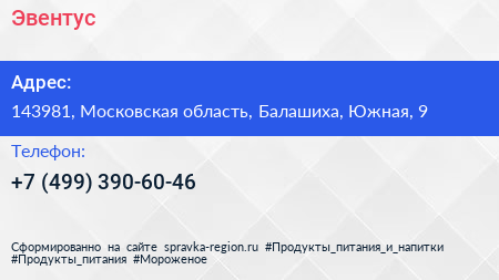 Эвентус по адресу 143981, Московская область, Балашиха, Южная, 9 в дальнейшем Организация, размещена в следующих категориях: