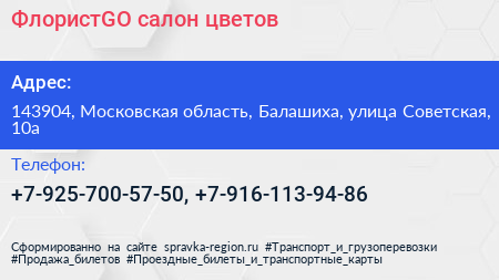ФлористGO, салон цветов по адресу 143904, Московская область, Балашиха, улица Советская, 10а в дальнейшем Организация, размещена в следующих категориях: