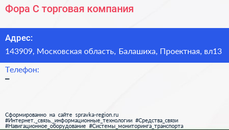 Фора-С, торговая компания по адресу 143909, Московская область, Балашиха, Проектная, вл13 в дальнейшем Организация, размещена в следующих категориях: