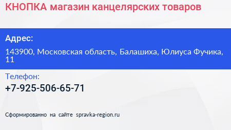 КНОПКА, магазин канцелярских товаров по адресу 143900, Московская область, Балашиха, Юлиуса Фучика, 11 в дальнейшем Организация, размещена в следующих категориях: