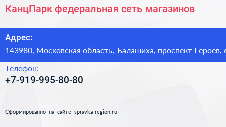 КанцПарк, федеральная сеть магазинов по адресу 143980, Московская область, Балашиха, проспект Героев, 6 в дальнейшем Организация, размещена в следующих категориях: