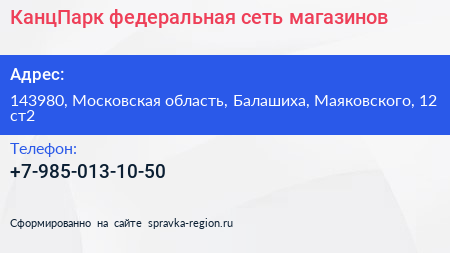 КанцПарк, федеральная сеть магазинов по адресу 143980, Московская область, Балашиха, Маяковского, 12 ст2 в дальнейшем Организация, размещена в следующих категориях:
