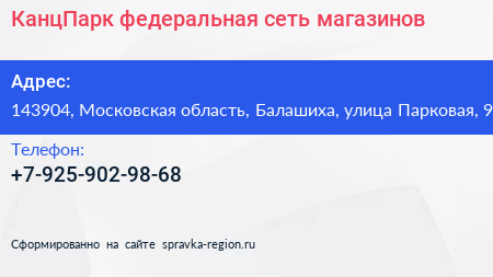КанцПарк, федеральная сеть магазинов по адресу 143904, Московская область, Балашиха, улица Парковая, 9 в дальнейшем Организация, размещена в следующих категориях: