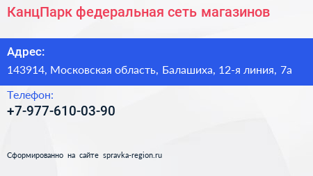 КанцПарк, федеральная сеть магазинов по адресу 143914, Московская область, Балашиха, 12-я линия, 7а в дальнейшем Организация, размещена в следующих категориях: