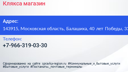 Клякса, магазин по адресу 143915, Московская область, Балашиха, 40 лет Победы, 33 в дальнейшем Организация, размещена в следующих категориях: