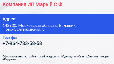 Компания, ИП Марый С.Ф. по адресу 143930, Московская область, Балашиха, Ново-Салтыковская, 8 в дальнейшем Организация, размещена в следующих категориях: