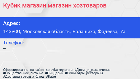 Кубик, магазин магазин хозтоваров по адресу 143900, Московская область, Балашиха, Фадеева, 7а в дальнейшем Организация, размещена в следующих категориях: