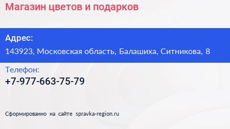 Магазин цветов и подарков по адресу 143923, Московская область, Балашиха, Ситникова, 8 в дальнейшем Организация, размещена в следующих категориях: