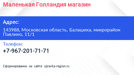 Маленькая Голландия, магазин по адресу 143988, Московская область, Балашиха, микрорайон Павлино, 11/1 в дальнейшем Организация, размещена в следующих категориях: