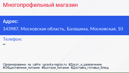 Многопрофильный магазин по адресу 143987, Московская область, Балашиха, Московская, 10 в дальнейшем Организация, размещена в следующих категориях: