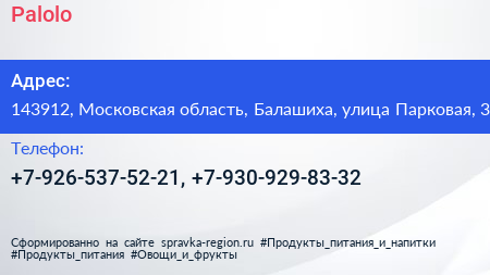 Palolo по адресу 143912, Московская область, Балашиха, улица Парковая, 3 в дальнейшем Организация, размещена в следующих категориях: