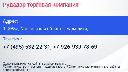 Рудадар, торговая компания по адресу 143987, Московская область, Балашиха, в дальнейшем Организация, размещена в следующих категориях: