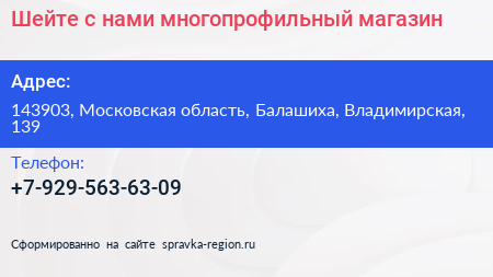 Шейте с нами, многопрофильный магазин по адресу 143903, Московская область, Балашиха, Владимирская, 139 в дальнейшем Организация, размещена в следующих категориях: